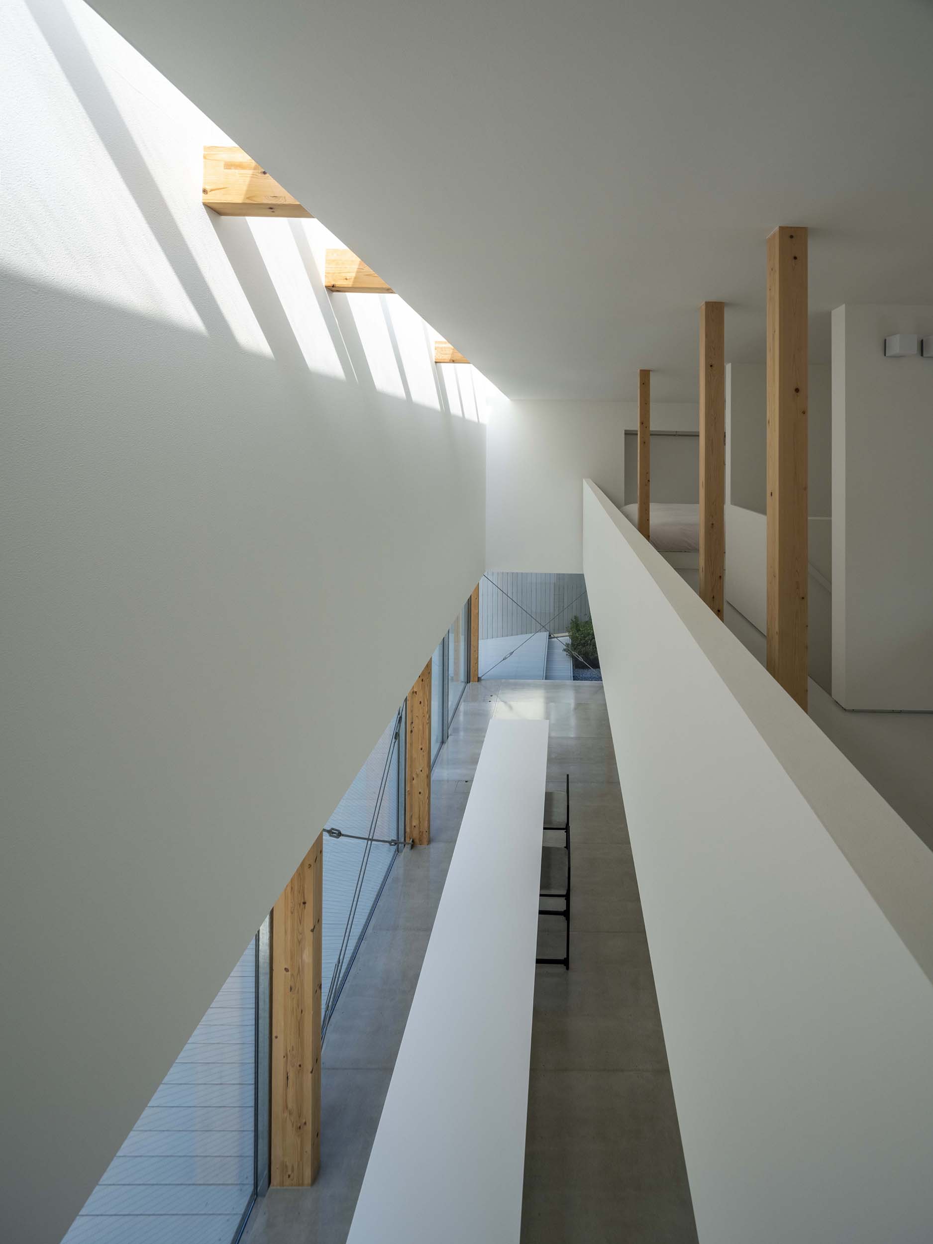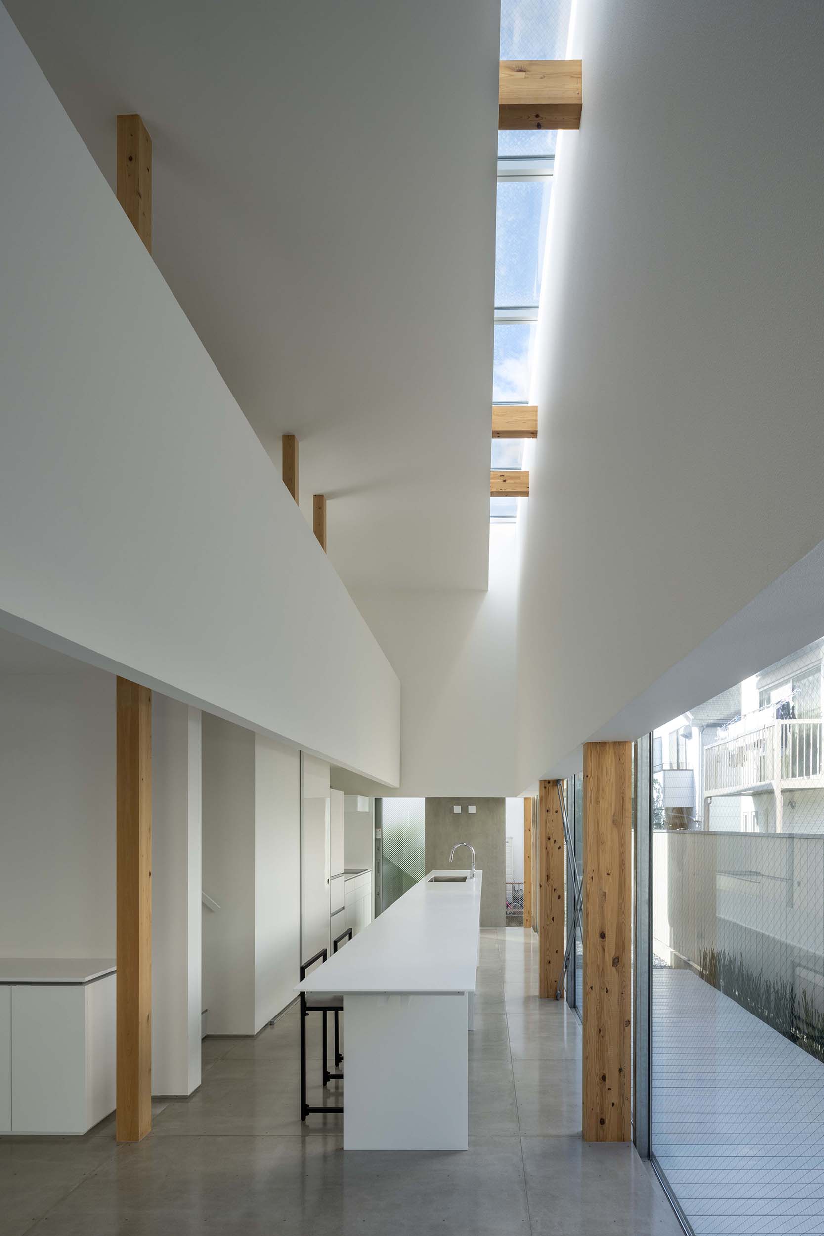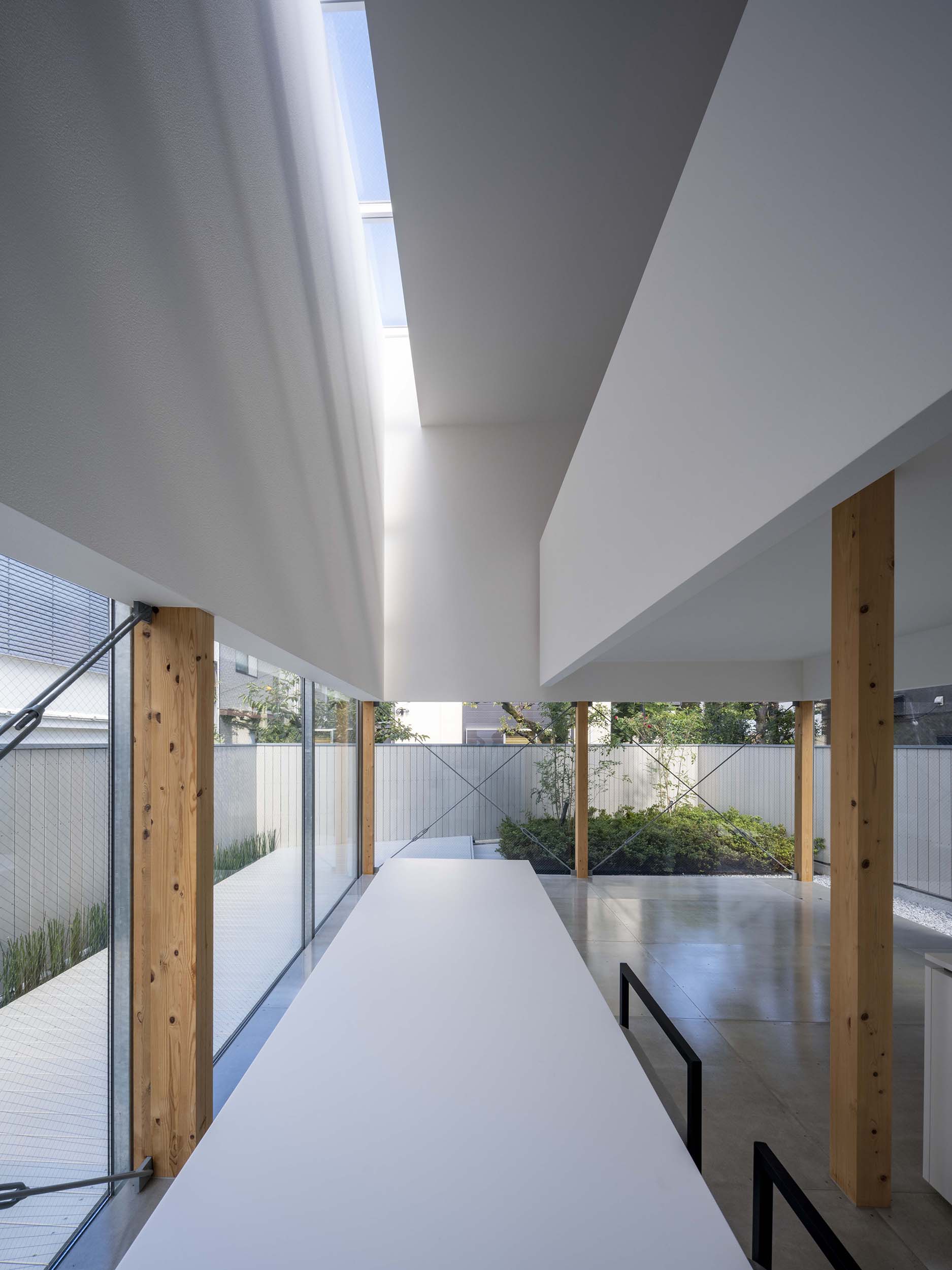一方、2層吹き抜けた北側の内壁には上部に東西幅のスカイライトを設け、天空からの光を受ける。こちらは「太陽光を導入するための開口」。