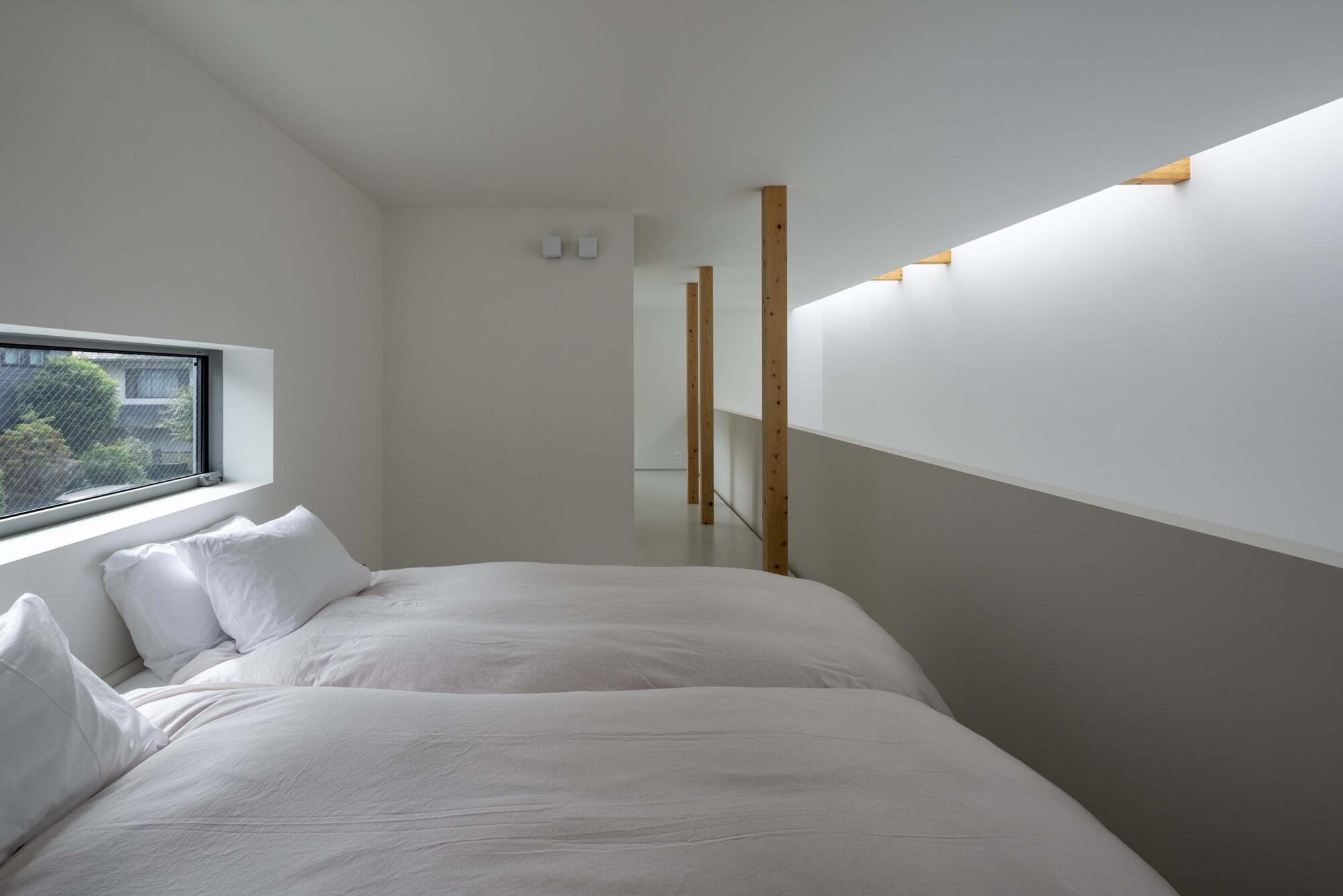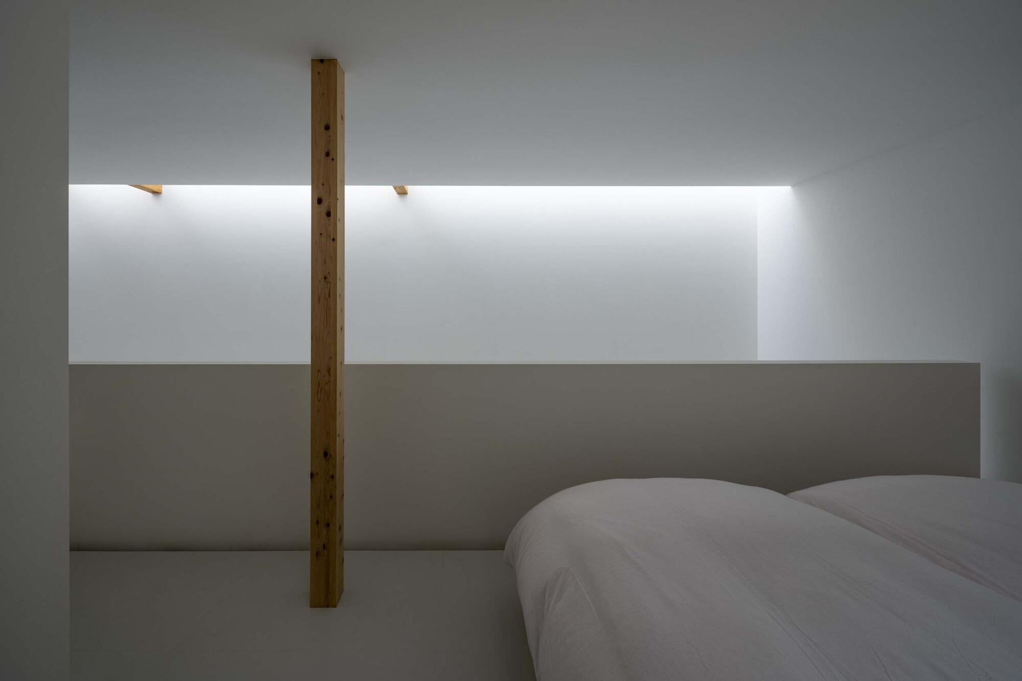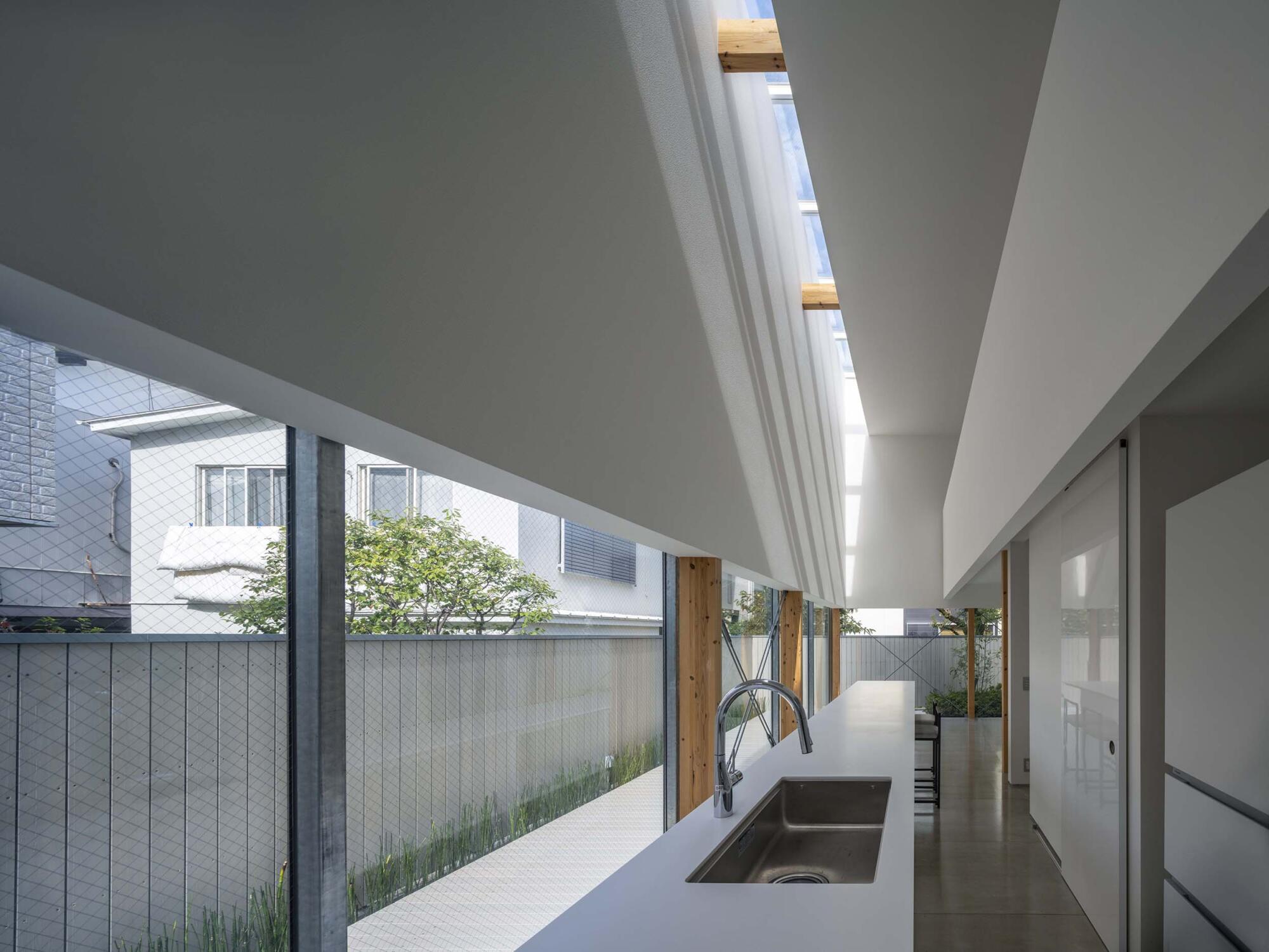 一方、2層吹き抜けた北側の内壁には上部に東西幅のスカイライトを設け、天空からの光を受ける。こちらは「太陽光を導入するための開口」。
