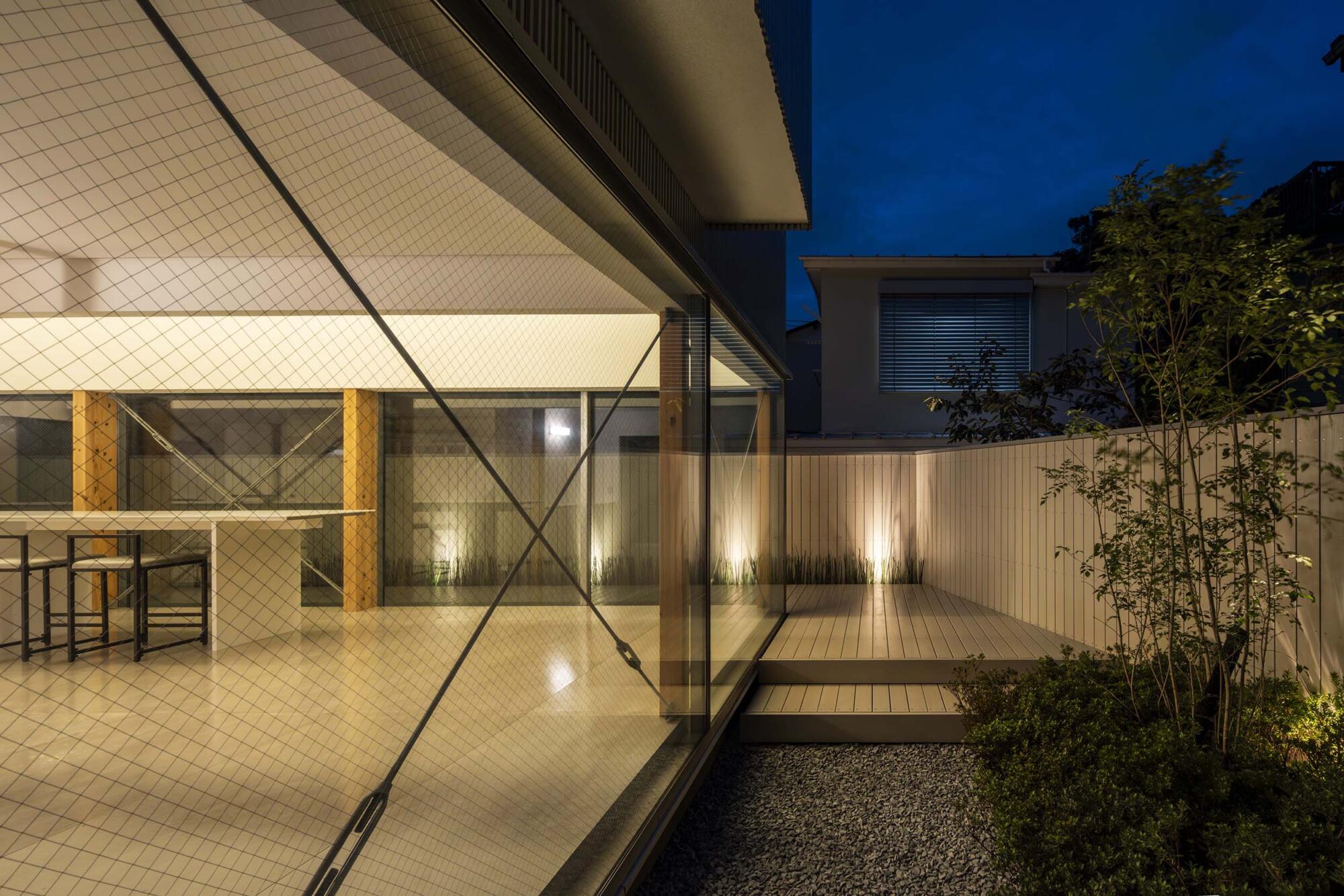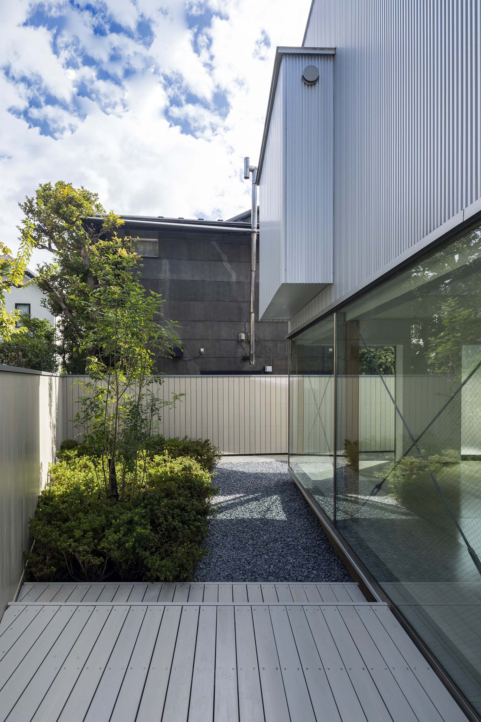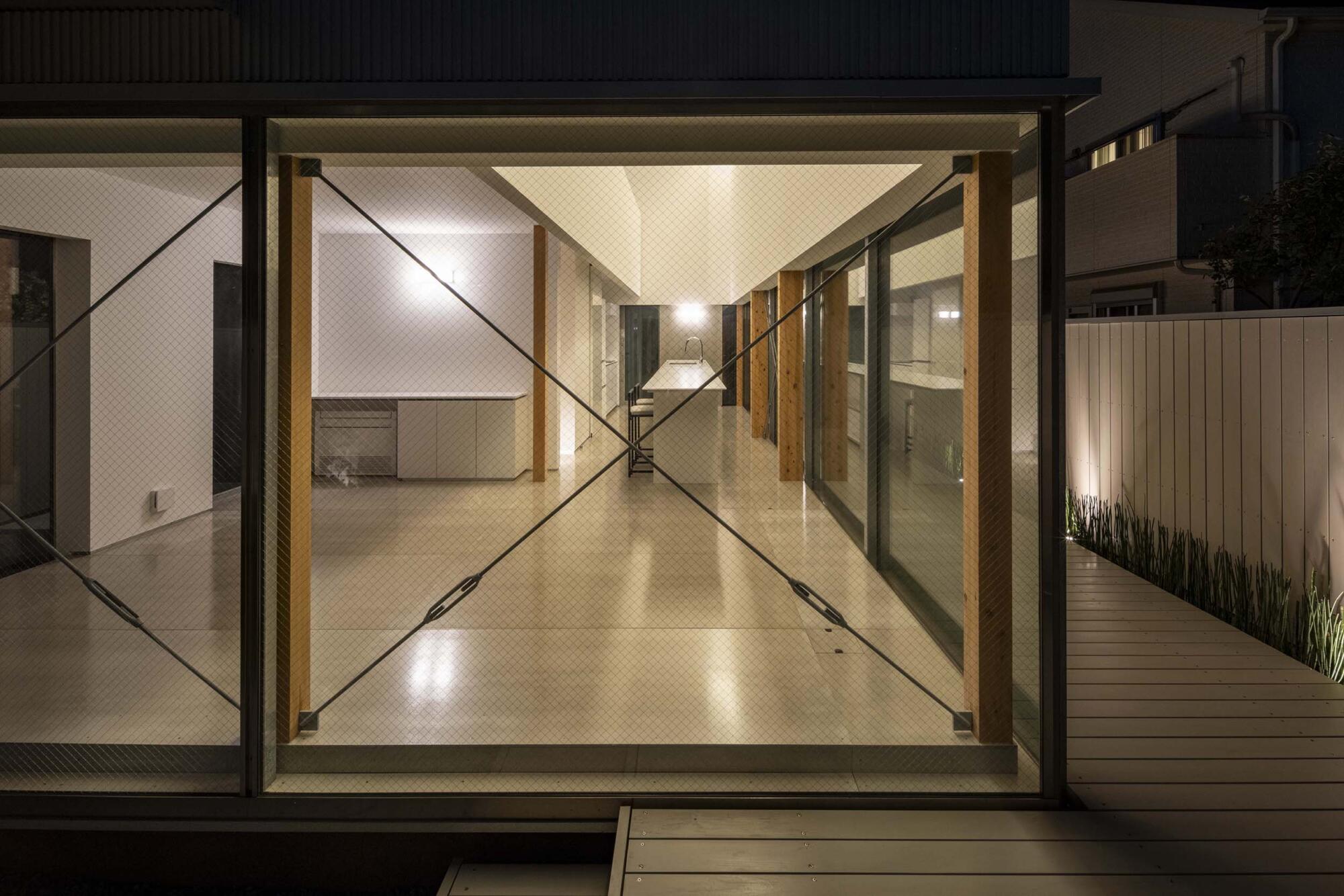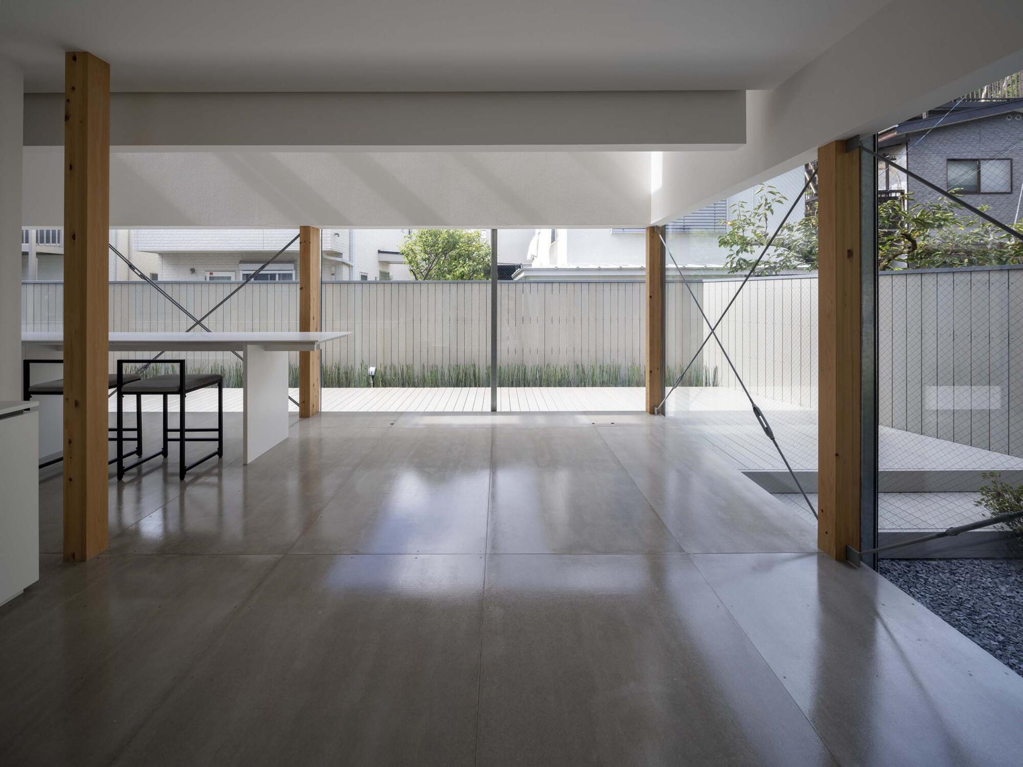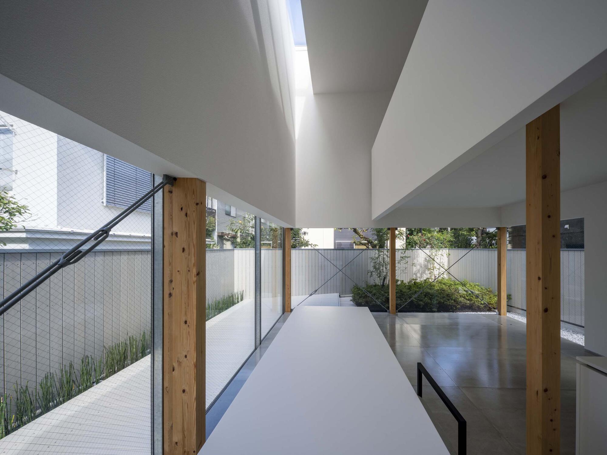 1階の水平連続開口は風景を見るための開口と考え、北側に南からの光を受ける風景、それも一番奥の壁手前に「とくさ」を植えてレマン湖ではないものの水辺を想起させる景色をつくり、そこに内部空間をつなげる。さらにその水平連続開口を北側だけでなく東と西へと廻りこませること。
