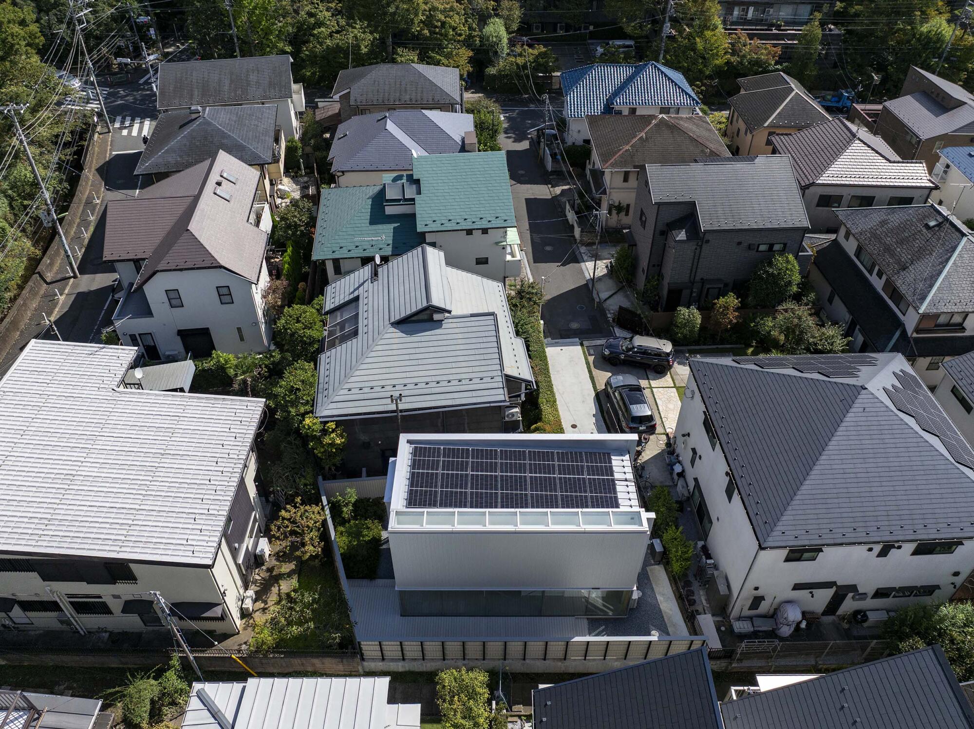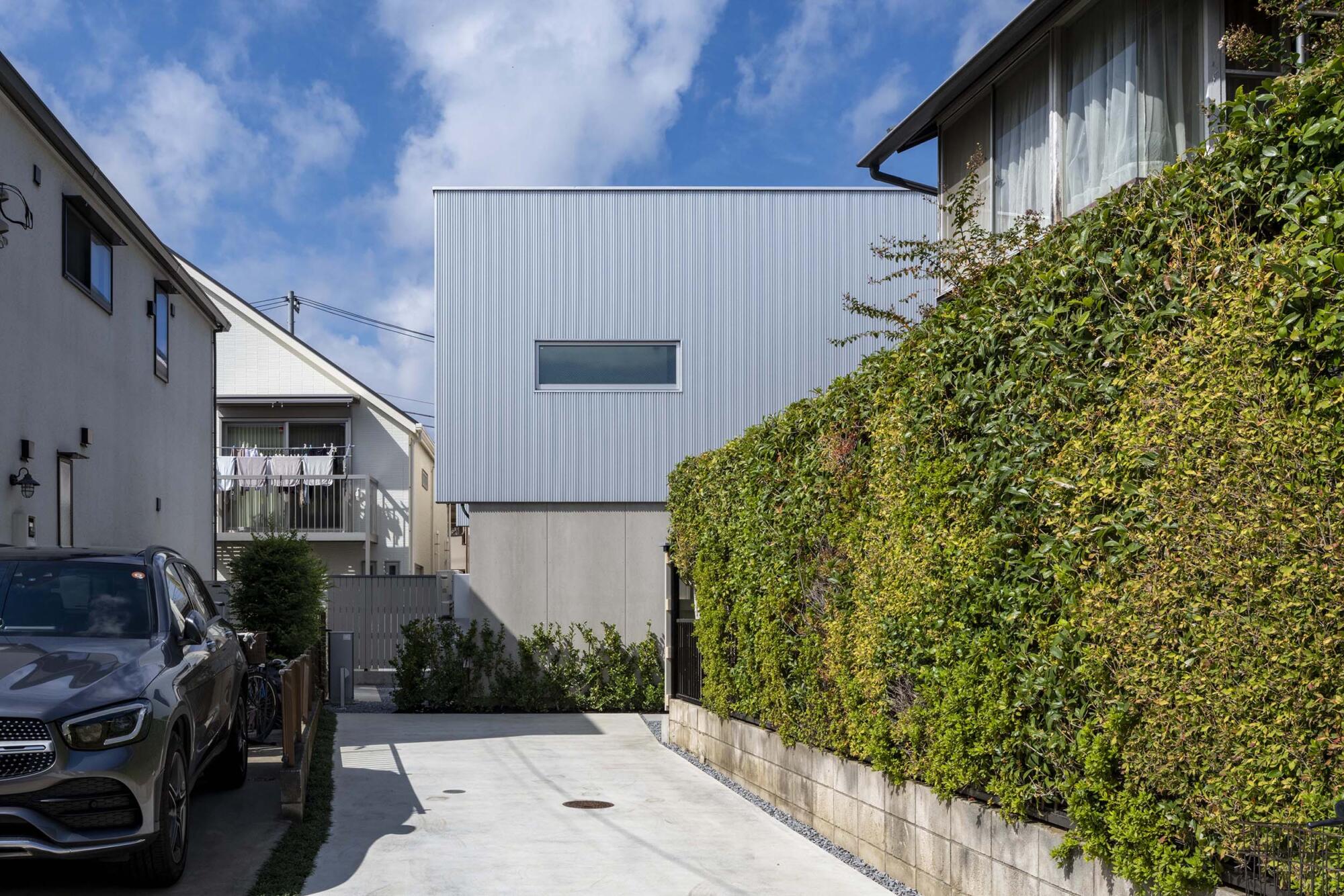 北方向に延びる狭い路地の先、さらに細く旗竿状に伸びる敷地の終わりに東西に長い長方形の敷地がある。接道する細い路地状の部分を除けば、敷地の4方向が隣地に囲まれている約100㎡で東西に長い長方形の敷地。しかも四周の隣地から1.5mのセットバックが求められている。残された敷地にはなんとか2階建てで60㎡程度の床面積が確保できることがわかった。東西に長い矩形の直方体で60㎡程度の住宅で何が可能か。
